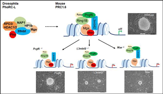 Polycomb最早在1978年被Edward B. Lewis发现的,它作为转录抑制因子调控果蝇体节的发育。同样,在哺乳类动物中,Polycomb通过抑制分化相关的基因来参与胚胎早期的发育和维持胚胎干细胞的多能性。Polycomb包含两种不同的蛋白质复合物PRC1(Polycomb repressive complex 1)和PRC2。其中PRC1含有E3连接酶Ring1A / B,它催化组蛋白H2A第119位的赖氨酸单泛素化(H2AK119ub1);而PRC2含有Ezh1/2,催化H3K27的三甲基化(H3K27me3)。PRC1/2复合物是怎样特异性识别并结合染色质来产生相关表观标记, 从而参与靶基因的调控一直是该领域研究的热点。 长期以来, 人们普遍认为这些复合物招募到特定基因的启动子区域依赖具有DNA识别能力的转录因子。几十年来,不少科学家加入到寻找该类蛋白因子的行列。可是,目前发现的几十个蛋白因子中没有一个能独立招募这些复合物。利用遗传学及其生物化学手段,我们发现PRC1复合物的一个亚型PRC1.6(包含L3mbtl2、Pcgf6、Ring1A/B、Rybp、Mga、Max、E2f6等)的招募是复合物中多个组分协同作用的结果(如上图)。任何一个组分的缺失,复合物的募集、靶基因的表达、胚胎干细胞的自我更新和多能性都会受到影响。与此同时,生化实验验证了哺乳类动物中的PRC1.6复合物与果蝇中的PhoRC在进化上具有高度保守性,所以它们具有类似的染色质招募机制。总之,我们发现了PRC1.6复合物独特的招募机制,为研究多梳蛋白在干细胞中作用的分子机制打开了一个窗口。另外, 对多梳蛋白分子机制的揭示也为干细胞技术向临床应用的转化奠定理论基础。