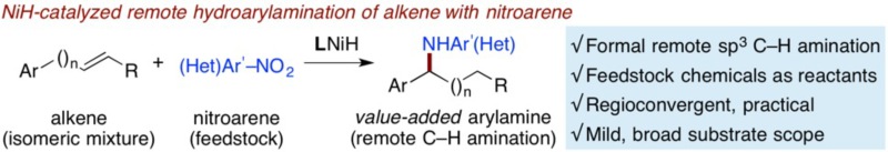胺广泛存在于活性药物分子、天然产物和农化品中,高效构建C–N键来制备胺一直以来都是合成化学研究的热点。另外一方面,芳胺合成中最直接的胺源来自于工业上大宗原料硝基芳烃的氢化。 受此启发,从廉价的硝基芳烃出发,近期朱少林课题组通过他们发展的NiH催化的远程官能团化策略,进一步实现了烯烃更富挑战性的区域归一性的远程氢胺基化反应,简洁、高效地实现了远程惰性的sp3 C–H键胺化(Chem 2018, 4, doi:10.1016/j.chempr.2018.04.008.)(图1)。论文链接:https://www.cell.com/chem/fulltext/S2451-9294(18)30176-1。进一步的研究表明,该策略对系列的烯烃和硝基芳烃都具有很好的通用性,能兼容系列敏感的官能团,可以分别实现苄位和酯的α-位胺化,制备相应的苄胺和α-氨基酸衍生物。
