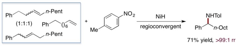石化工业上,烯烃位置异构体的混合物价格低廉,由于沸点相近较难通过精馏分离,如何直接利用这类附加值低的混合原料转化位高附加值的单一产品具有很高的经济价值。从烯烃混合物出发,作者验证了上面发展的策略对这类烯烃混合物具备良好的区域归一性,为工业应用提供了可行性支撑(图2)。