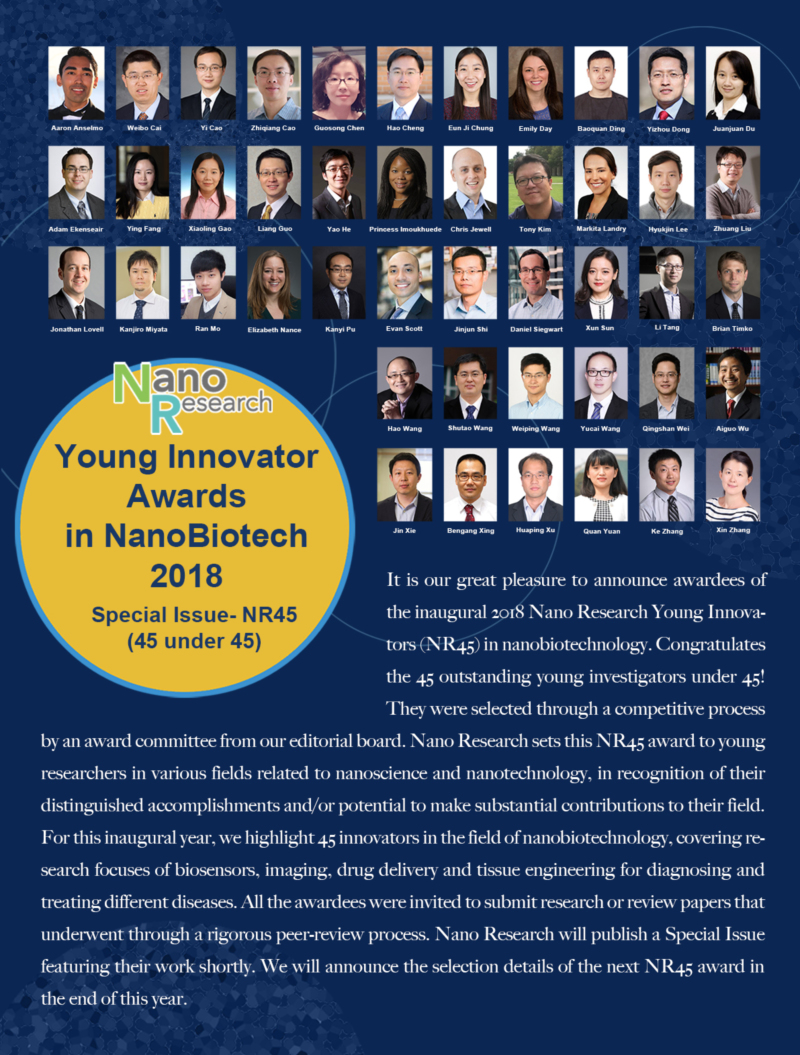 本次全球共有45位年龄不超过45周岁的青年学者获此殊荣。该奖项由Nano Research编委会于今年首次设立的国际性的纳米研究青年创新奖,旨在表彰对纳米科学技术相关领域做出突出贡献的青年科研人员。此奖项将每年评选一次,由Nano Research杂志编委组成的评奖委员会,在全球范围内通过遴选流程确定最终人选。首次的评比仅在纳米生物科技领域开展,包括生物传感器、生物造影、药物传递、用于疾病诊疗的组织工程等。所有获奖者的工作成就将在近期的Nano Research Award Special Issue予以展示。