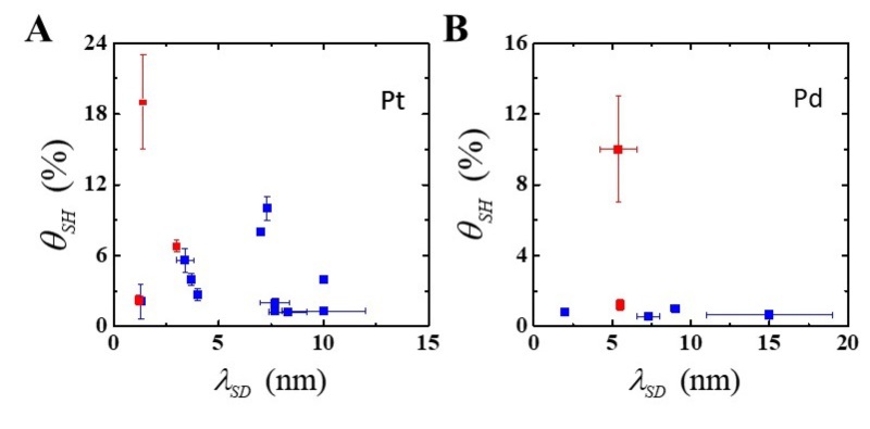 图1:文献当中报道的Pt(A)和Pd(B)的自旋霍尔角和自旋扩散长度分布。