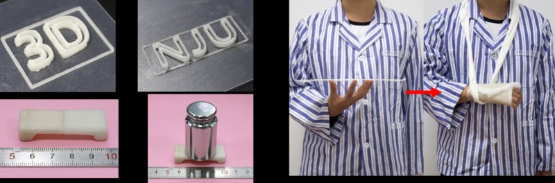 该材料在多方面具有良好的应用前景。其中之一是可进行3D打印。3D打印技术是本世纪制造业领域迅速发展的一项新兴技术。但3D 打印技术也有其自身的缺点:首先,通过3D打印材料所制备的产品,由于是一次整体成型的,而且都是独一无二的,在自身产生微裂纹或受到外界破坏后,无法通过更换零部件的方式进行修复,只能整体废弃。这样一来,将增加产品的维护成本,并造成极大的浪费;其次,3D打印产品的尺寸受到打印机尺寸的限制,通常的3D打印机无法打印比自身更大尺寸的物件;另外,3D打印中逐层成型的过程导致所得到的物件机械力学性质各向异性,在使用过程中容易产生裂纹、变形等破损。将自修复技术引入到3D打印中则可有效解决这些问题。利用该材料打印出来的产品受损之后可以快速修复,通过打印小物件然后利用自修复技术能够将小物件组装成一体化的大物件,同时打印出来的产品具有各向同性的机械力学性质。因此,利用自修复材料可以将传统砖块堆砌方法和现代3D打印技术的优势结合起来,使3D打印更加随心所欲!