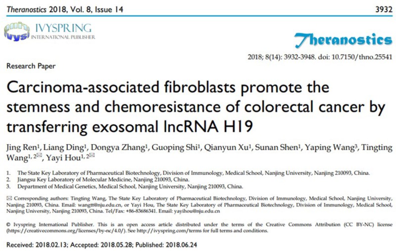 近日,凯发k8官网医学院侯亚义教授和王婷婷教授课题组在医学杂志《Theranostics》上发表论文,阐述了lncRNAs H19和肿瘤相关成纤维细胞(CAFs)在结直肠癌干性维持和奥沙利铂耐药中的作用,并揭示了CAFs衍生的外泌体通过转移lncRNA H19激活Wnt /β-catenin信号的分子机制。本研究加深了我们对结直肠癌发生、结直肠癌干性的维持和化疗药物耐受过程的理解,为结直肠癌的临床治疗提供了新的思路和靶标。
