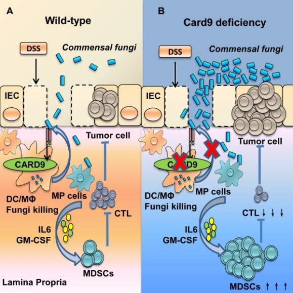 综上所述,本研究证实:在正常状态下,肠道共生真菌C.tropicalis可易位至肠道固有层,通过CARD9分子被宿主的天然免疫细胞----巨噬细胞识别清除。而在CARD9分子缺失时,增多的C.tropicalis 可促进髓系细胞向MDSCs细胞分化,并激活MDSCs的免疫抑制活性,从而促进结肠肿瘤的发生发展(图1)。该研究证实了CARD9介导的抗真菌免疫应答在维持肠道稳态和诱导肠道肿瘤中的重要作用,阐述了肠道共生真菌在结肠肿瘤发病中机制,对于临床结肠肿瘤的诊治具有重要的指导意义。