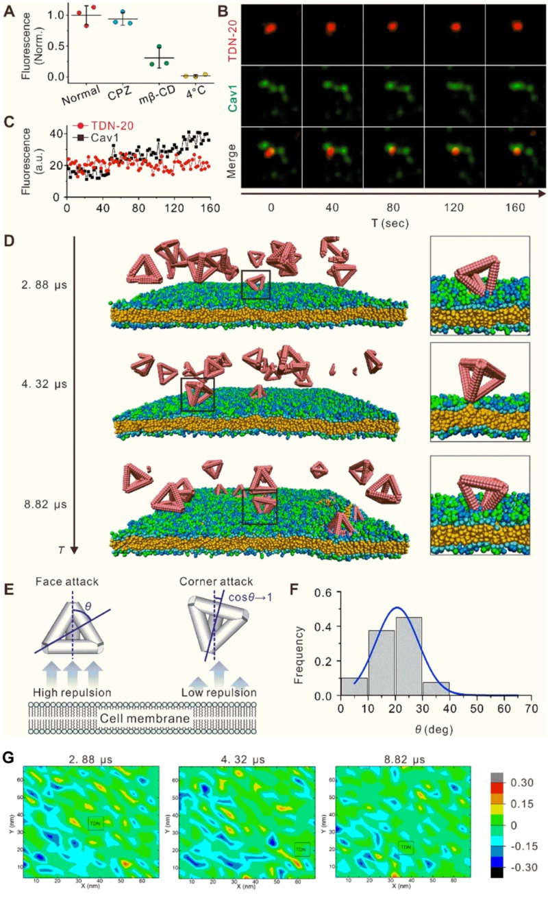 在这项工作中,课题组首先合成了棱长为20 bp的正四面体DNA纳米结构(TDN-20,带负电)。细胞实验表明,TDN-20可以通过小窝蛋白介导的内吞作用(caveolin-mediated endocytosis)高效地进入癌细胞中(图1A-C)。接着通过计算机模拟,发现TDN-20往往采用角攻击(corner attack)的方式接触细胞膜(图1D-F),同时在进入细胞过程中倾向于选择负电性较低的区域(图1G)。值得一提的是,与带负电的球形纳米粒子(无法进行角攻击)相比,TDN-20的摄取效率是它的2倍以上。进一步地,通过计算体系能量,课题组发现这两种方式的确能够有效地降低TDN-20与负电细胞膜间的静电排斥作用,从而极大地提高其进入细胞的效率(图 2)。