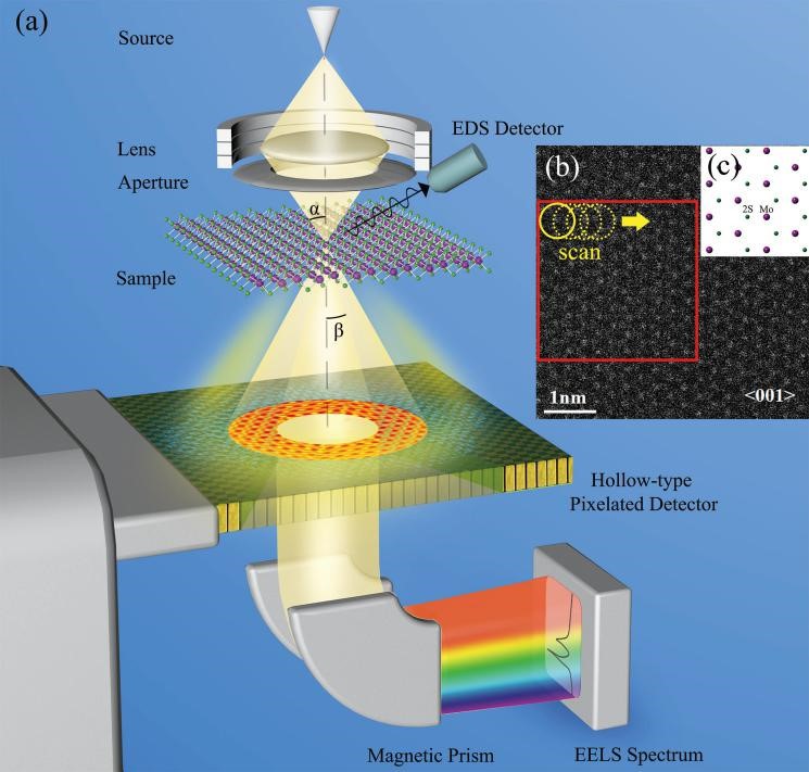 图1(a)光路原理示意图;(b)[001]方向二硫化钼的高角环形暗场电镜图像;(c)[001]方向二硫化钼原子模型图。