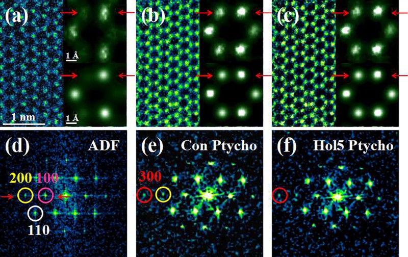 图2(a)环形暗场像(ADF);(b)传统叠层重构的相位像;(c)中空衍射图案叠层重构的相位像;(d)-(f)对应的傅里叶变换结果