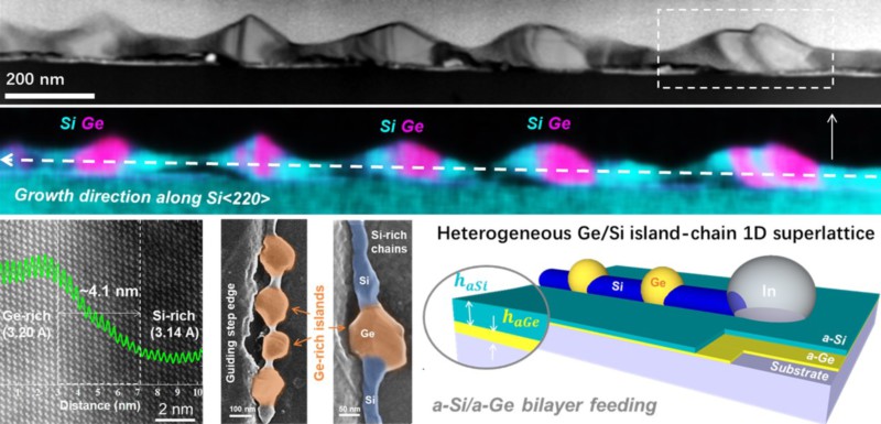 图1. 动态跳跃液滴诱导生长异质锗-硅超晶格岛链纳米线结构。