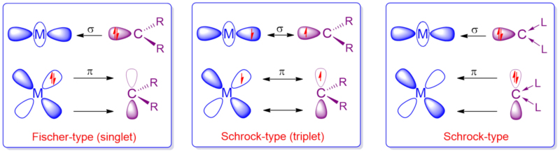 碳是化学中最基本的元素之一,理解碳与其它元素之间的成键本质是化学研究的中心议题。另一方面,含金属-碳双键的过渡金属卡宾化学发展迅猛,且在合成化学领域展示出巨大的应用前景。根据碳原子的不同性质,金属卡宾的成键模式可以分为以下三类。目前,人们对单线态Fischer型金属卡宾和三线态Schrock型金属卡宾已有深入研究,而碳原子同时作为σ和p电子给体的研究较少。