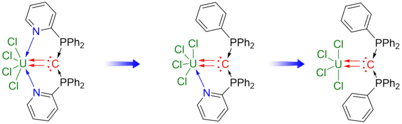 朱从青教授课题组设计合成了一类新颖的三齿螯合型卡宾前体,其经去质子化,可同时作为σ和p电子给体与f 区金属配位,得到含f区金属-碳双键的物种(图2)。通过对配体螯合位点的调节,成功得到双齿和单齿螯合的f区金属-碳双键配合物,表明非螯合型双重配位键物种仍能稳定存在。X-射线单晶衍射结果发现这些配合物中金属铀–碳键长(2.4 ?)与已报道的铀–碳双键键长相当。通过与德国马堡大学Gernot Frenking教授和凯发k8官网工业大学赵莉莉教授理论计算方面的合作,发现铀与碳之间确实通过双重配位键结合,也即碳原子的两对孤对电子通过σ-和π-给体同时与金属铀作用,形成双键,而不是传统意义上的金属卡宾键。从而首次提出碳与f区金属元素之间双重配位键的概念。