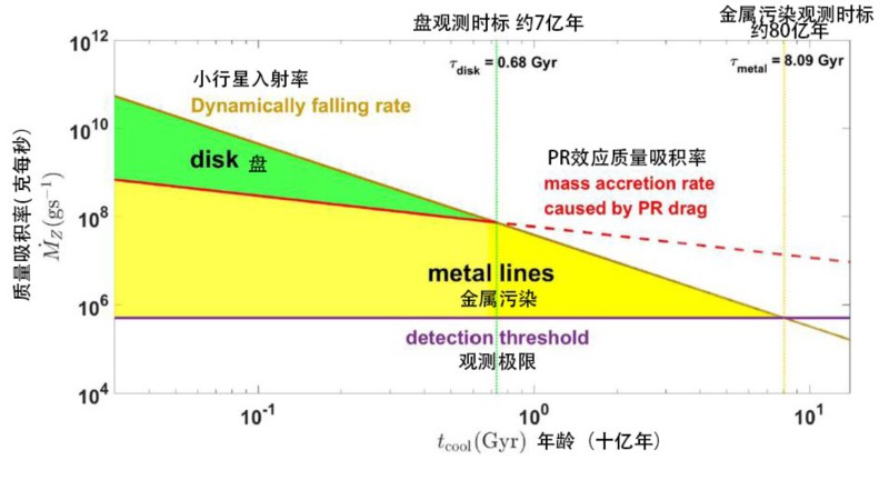 图1:理论模型示意图。小行星在外围木星的摄动作用下,到达白矮星周围,逐步演化为尘埃。尘埃在恒星辐射的作用下,进入白矮星大气。通过观测数据统计,发现质量吸积率随年龄呈现为分段幂律衰减(绿色线),与理论模型预期符合的很好。