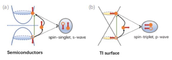 图2:带间激发光学过程示意图。(a)普通半导体中产生自旋反向电子-空穴对,通常产生s-波激子。(b)拓扑表面态的螺旋自旋构型倾向于产生自旋同向的电子-空穴对。