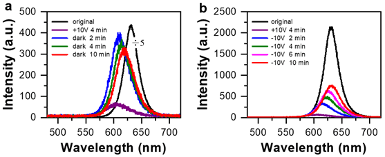 图2. (a) 高密度CsPbBr1.2I1.8纳米晶薄膜在黑暗中施加+10 V电压之前和4分钟之后的荧光光谱(电致蓝移),以及电场撤除不同时间后测量得到的红移荧光光谱。(b) 高密度CsPbBr1.2I1.8纳米晶薄膜在黑暗中施加+10 V电场偏压之前和4分钟之后的荧光光谱(电致蓝移),以及施加反向-10 V电压不同时间后发光波长快速红移至起始位置的荧光光谱。