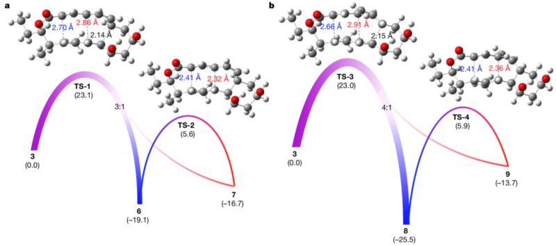 为了更好地理解[6+4]、[4+2]环加成反应和[3,3]-Cope重排反应之间的相互关系,研究人员通过密度泛函理论计算了反应的热力学和动力学。有趣的是,底物3越过单一过渡态后可歧化成两个方向,分别生成[6+4]、[4+2]反应产物,由于[6+4]化合物在热力学上更稳定,[4+2]产物可再经Cope重排自发转化成[6+4]产物。此理论计算结果与实验观察结果相吻合,进一步证明了之前的推断。