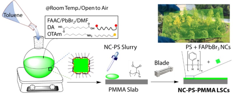 图2.可控合成甲脒铅溴纳米晶和涂布法制备太阳能聚光发电窗户 (Journal of Materials Chemistry A, 2019, 7, 4872–4880)。