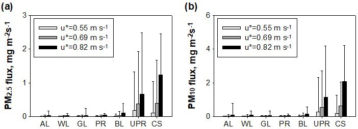 图2. 不同地表的PM10和PM2.5潜在释放通量。