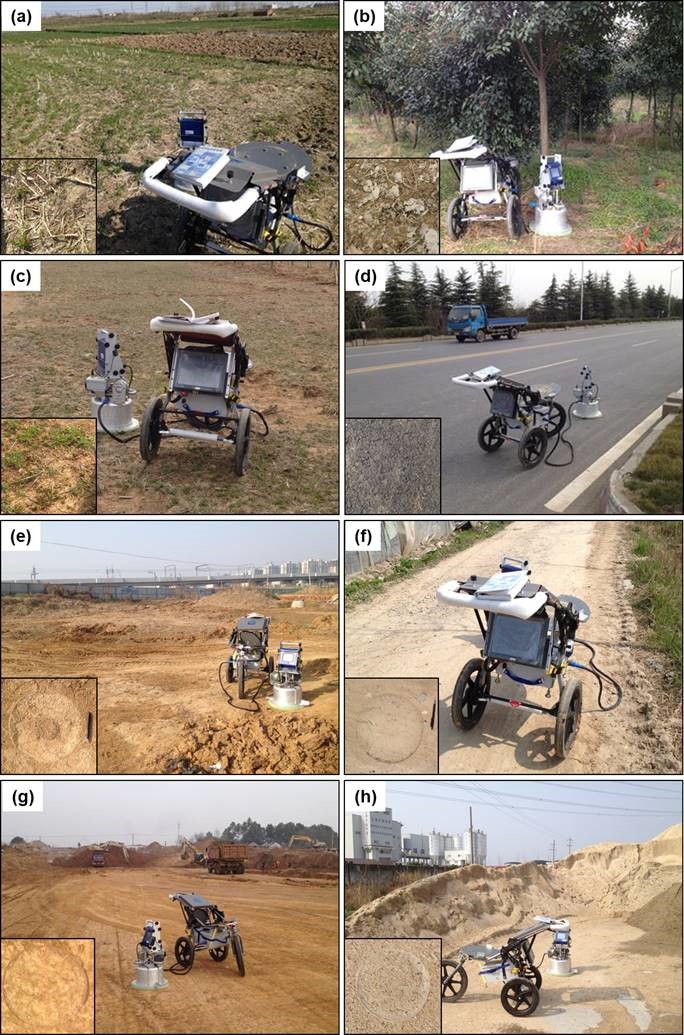 图1. 测试地表: (a)农田,(b)林地,(c)草地,(d)铺装道路,(e)裸地,(f)未铺装道路,(g)建筑工地,(h)建筑工地砂石堆。