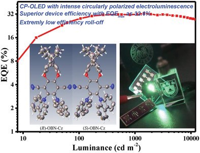 手性发光材料由于具有特殊的左、右手性结构,除了能够发射出普通的光致发光外,还能够发射出圆偏振光(CPL),以手性发光材料为发光中心制备能够直接发射出圆偏振电致发光(CPEL)的器件,即CP-OLEDs,在3D显示领域有极大的应用前景。但国际上的文献报道很少,并且器件的亮度和效率普遍很低,效率滚降严重,而且非对称g因子也不稳定,不能满足应用的需求。