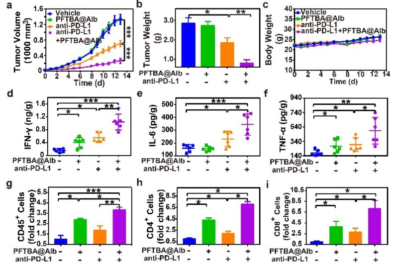 本研究表明,全氟化碳纳米粒可以有效抑制血小板功能性活化,进而有效打破血小板维持的肿瘤血管屏障,增加血管渗透性,促进T淋巴细胞在肿瘤部位的蓄积浸润,使肿瘤免疫环境得到有效改善。团队研究人员进一步将该纳米粒联合PD-L1抑制剂进行研究,发现全氟化碳纳米粒可以显著增加肿瘤部位具有免疫活性的CD4+和CD8+T细胞浸润。相较于anti-PD-L1抗体单独给药,联合给药组显著增强了anti-PD-L1抗体对肿瘤的免疫应答效应,产生了更好的抗肿瘤效果。这一研究成果将对现有的PD-L1治疗出新的思路。