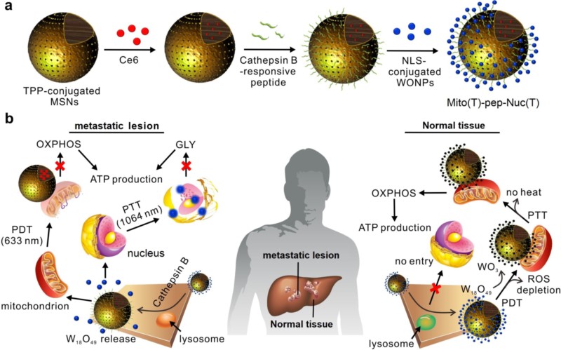 研究人员选取了多孔硅作为光动力药物的载体(A unit),通过Cathepsin B酶响应性氨基酸链段将非化学计量比氧化钨纳米球(B unit)偶联至硅球表面,形成一种行星-卫星结构。其工作原理如图一所示,肿瘤细胞内高酶切活性导致了A,B units的分离,并促成二者最终分别富集于线粒体和细胞核内。通过次序给予激光照射,经由线粒体和细胞核调控的氧化磷酸化和无氧糖酵解均被抑制,切断了癌细胞的能量来源—ATP的产生。正常的肝细胞及库普弗细胞(Kupffer cells)缺乏足够的酶切活性,纳米载体的结构得以维持,这导致第一步激光照射产生的活性氧被卫星状分布的非化学计量比氧化钨所吸收。在第二轮激光照射中,作为光热发生介质的B unit由于在第一轮与活性氧作用下,作为活性中心的W(IV)被氧化,而丧失了光-热转化能力,最终保护正常组织免受热损伤。