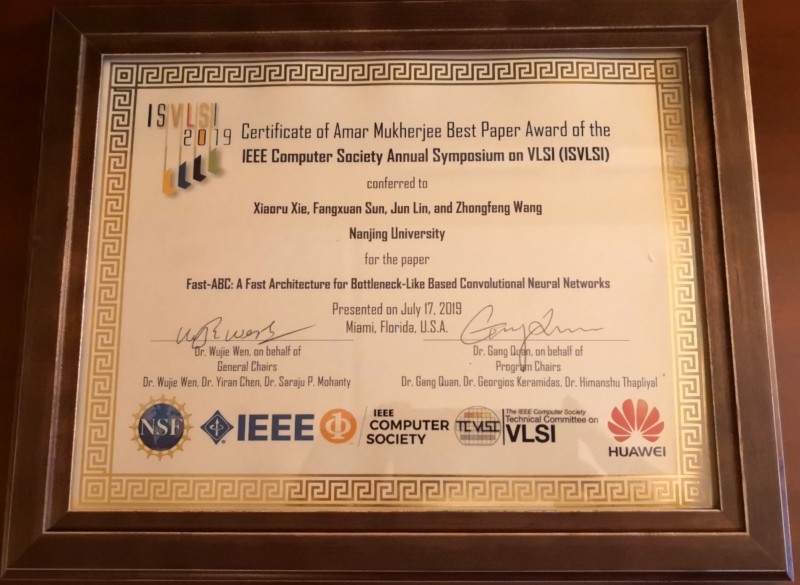 2019年7月15日-17日,IEEE计算机学会VLSI年度研讨会(ISVLSI, http://www.eng.ucy.ac.cy/theocharides/isvlsi19/index.html) 在美国佛罗里达州举行,凯发k8官网电子科学与工程学院王中风教授团队有两篇论文从161篇文章中脱颖而出,入选“最佳论文提名”(会议共6篇提名),其中论文Fast-ABC: A Fast Architecture for Bottleneck-Like Based Convolutional Neural Networks(作者:谢逍如,孙方轩,林军,王中风),最终获得大会颁发的“最佳论文奖”(共2篇)。据了解,这是中国大陆高校的学者首次获此殊荣。在2018年王中风教授团队首次参加ISVLSI会议时,就曾有一篇文章获得了“最佳论文提名”。ISVLSI年度研讨会是VLSI领域的权威国际会议之一,涉及范围包括超大规模集成电路相关主题和新兴的应用领域,如硬件安全和人工智能等。