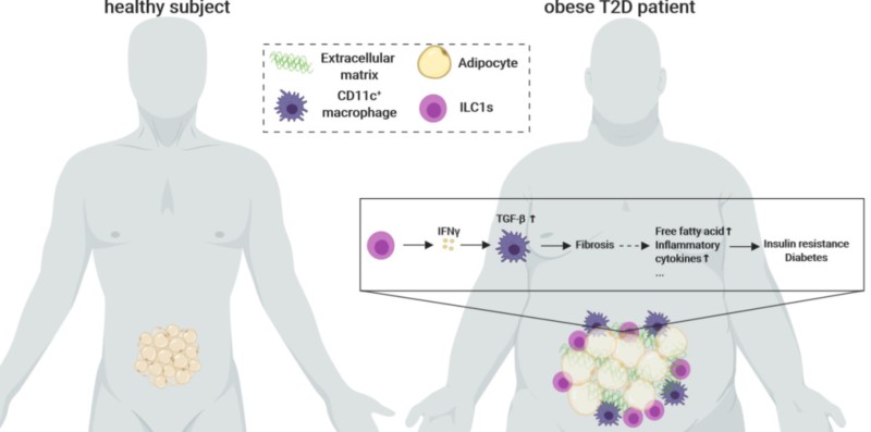肥胖促进了2型糖尿病的流行,其中脂肪组织免疫紊乱导致的炎症、纤维化和胰岛素抵抗是促发2型糖尿病的关键诱因,但其区域免疫特性以及与疾病内在联系尚未阐明。固有免疫细胞(ILCs)是一类新型免疫细胞群体,包括ILC1,ILC2和ILC3,在黏膜组织和多器官广泛分布,以ILCs为核心的免疫调控网络在代谢性疾病中的作用初现端倪,但其在人类2型糖尿病中的作用及具体机制仍不清楚。
