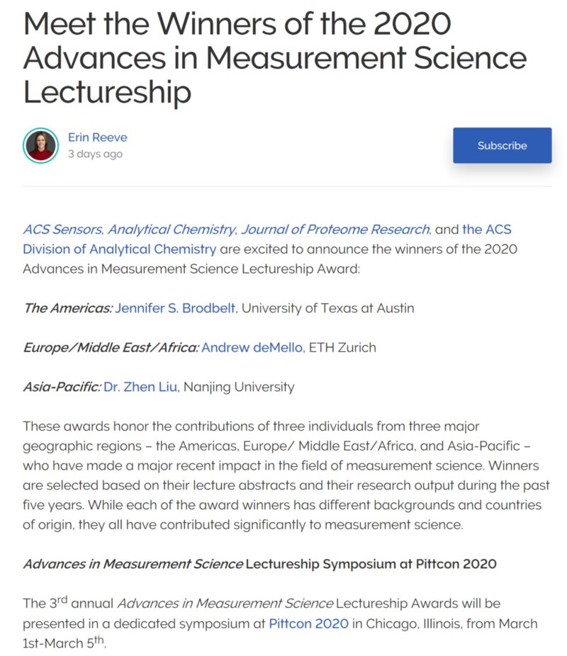 10月1日,美国化学会(ACS)公布2020年度测量科学进展讲座奖(Advances in Measurement Science Lectureship Award)获奖人名单,我校化学化工学院刘震教授为三名获奖人之一。该奖项为ACS旗下的测量科学方面的三个主要期刊,包括《ACS传感器》(ACS Sensors)、《分析化学》(Analytical Chemistry)、《蛋白质组研究杂志》(Journal of Proteome Research),及ACS分析化学分部(the ACS Division of Analytical Chemistry)联合颁发,以表彰在测量科学领域近期取得重要影响和贡献的三名科学家,每个年度美洲、欧洲/中东/非洲、亚太各一名。该奖是第三届,刘震教授为荣获该奖的第二位中国科学家。该奖的颁奖仪式将于明年3月初在美国芝加哥召开的匹兹堡会议上进行。