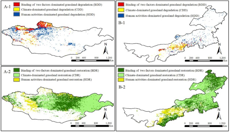 The spatial distribution of grassland degradation in MG (A-1) and IM (B-1) and restoration in MG (A-2) and IM (B-2) induced by climate and human factors.