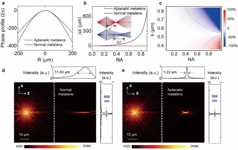 2 消球差超构透镜的相位设计。(a)相位分布;(b)球差随数值孔径的变化;(c)归一化球差的宽带表现;(d)对点源成像的模拟结果对比。