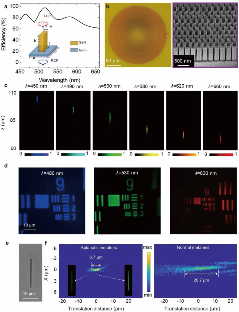 3 消球差超构透镜的性能表征。(a)氮化镓单元结构的模拟偏振转化效率;(b)消球差超构透镜(NA=0.78)的光学显微和扫描电子显微图;(c)色散表征;(d)横向分辨率测量,可见光波段内至少达775 nm;(e)纵向分辨率测试狭缝;(f)纵向分辨率对比测量。
