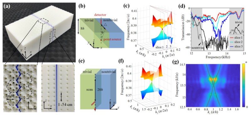 图4. (a) 声学样品示意图。左下:俯视放大图;右下:侧视放大图。(b) 实验设置图:用于测量二维声学表面态的方向性色散。(c) 三张声表面态色散切片图,分别对应角度0,arctan(0.5a/8h)和arctan(a/8h)。(d)不同方向声透射谱的实验测量结果。其中,红、青、蓝分别对应切片1-3。(e) 实验设置图,用于测量z向声表面色散。(f) ky=0时的声表面态色散切片。(g) z向声表面色散实验测量图。