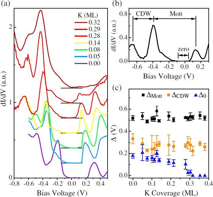 图 1: (a) 在不同K原子覆盖度的1T-TaS2表面获得的dI/dV谱;(b) 1T-TaS2谱中的三种能隙;(c) 三种能隙的大小随K原子覆盖度增加的演化过程