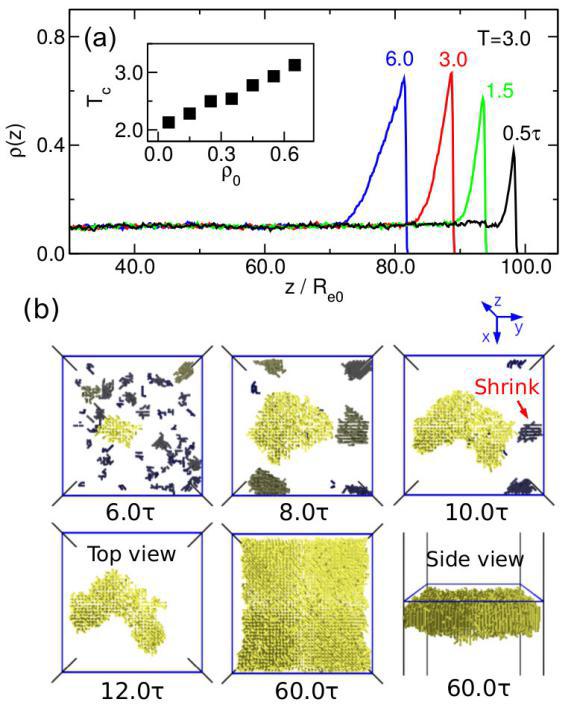 图1显示在快速蒸发过程中随着界面向左退缩的高分子浓度分布及其界面结晶形貌。可以看到高分子在自由表面处形成高浓度表皮层。对于结晶高分子而言,其在溶液中的结晶能力与高浓度直接正相关:图1(a)中的插图显示随着单体体积浓度从0.05增加到0.65,结晶约化温度从2.0增加到3.1。因此在特定温度(例如3.0)下,本体浓度为0.1的溶液无法结晶,但是当快速蒸发形成的表皮层浓度高达0.65时,仍然可以结晶,且只会限制在二维表皮层。图1(b)显示高分子晶核在快速蒸发过程中,其中小部分特定取向的晶核获得持续的生长,而其它晶核则逐渐消失,显示出典型的Ostwald熟化过程。最终结晶时刻t=60.0τ晶核生长成二维高分子单晶。