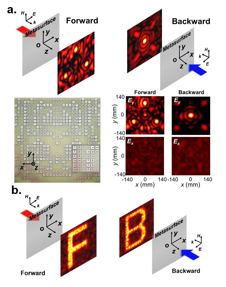 图2 Janus超构表面的实验验证。(a)双向电磁波非对称聚焦。(b)双向非对称全息成像。