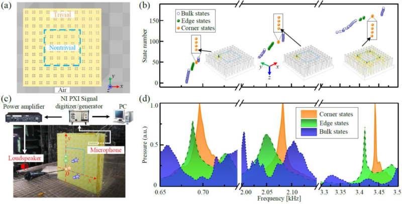 图2:(a) “回”形声子晶体示意图,平庸(trivial)结构的初基元胞由超元胞内腔体收缩间距构成,而非平庸(nontrivial)结构则由扩大间距组成。(b) “回”形声子晶体对应的本征频率。(c) 实验装置示意图。(d) 实验测得的角态、边界态和体态对应的谱图。