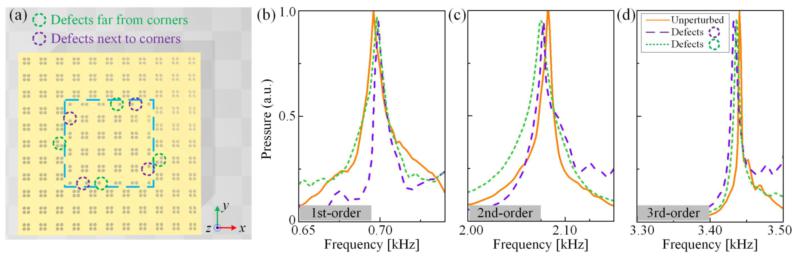 图3:(a) 在边界上随机地引入一些缺陷。(b)-(d) 引入不同缺陷位置时,实验测得的三个频带内的角态谱图。