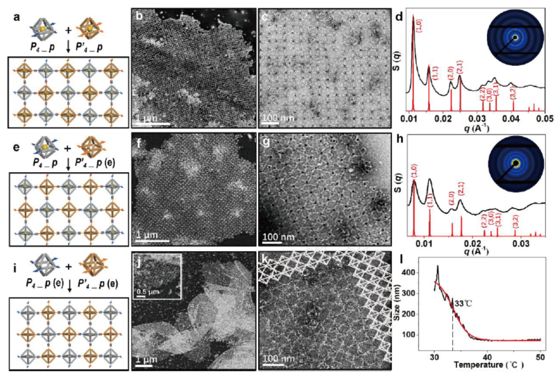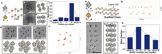 实验结果表明,不同维度上的多种团簇结构均能够按照预期形成,同时展现出可观的装配精准性和产率。在透射电镜(TEM)和扫描电镜(SEM)下不仅观察到了不同结构的组装产物,更论证了该编码策略的可靠性。在表征过程当中,研究人员还与上海光源、国家蛋白质科学中心以及凯发k8官网亚原子分辨中心的相关专家展开合作,借助X-射线小角散射(SAXS)、冷冻电镜(Cryo-EM)以及三维重构(3D-reconstruction)等多种技术手断多角度展现了胶体纳米粒子在不同结构中的排列方式和真实状态。