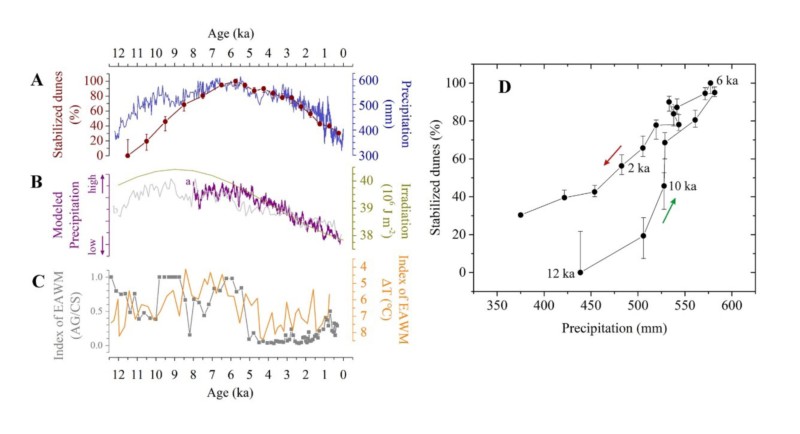 围绕干旱区环境变化,我校地理学院鹿化煜教授的研究团队在我国北方沙漠沙地开展了二十年的研究工作。近年来,在科技部重点研发计划和国家自然科学基金等项目的支持下,他们对多个沙漠沙地开展了“拉网式”考察和大量样品采集、测试分析,构建了近百个有精确年代控制的风沙沉积记录,取得了一系列科研成果。2016年起,该团队徐志伟博士等与我校生科院徐驰教授团队协同美国、荷兰、以色列以及国内多个高校的学者组成的多学科联合团队,针对我国北方半干旱地区的主要沙地(包括毛乌素沙地、浑善达克沙地和科尔沁沙地等)144处风沙沉积进行了基于过程分析的点位特异性重建与集成,利用500多个地层-独立年代数据和古气候重建-模拟资料,获得了这些沙地过去一万两千年的环境变化历史(分辨率达到五百到一千年)。研究发现,我国北方沙地在过去一万两千年以来就存在与现今类似的流动沙丘与固定沙丘共存的现象,并且在距今六千年前后流动沙丘面积最少。受到季风降水变化的影响,在局部沙丘状态(流动或固定)的变化在较短时间内发生,表现出明显的突变特征,但突变发生的时间节点具有显著的不同步特征,其演化轨迹也具有鲜明的空间异质性。沙丘双稳态格局的形成及状态突变主要与植被、土壤与风沙活动之间的多种正反馈作用有关,并且受到生态系统内部过程的调节。在全域尺度上的重建结果表明,由于局部空间异质性特征相互抵消,这些沙地的总体状态演化表现为渐变特征,并且与季风降水存在较为明确的定量关系(但仍然存在迟滞现象)。这一研究成果有助于理解目前我国北方沙漠沙地环境变化机理以及预测区域环境变化趋势。这项研究凸显出考虑空间尺度和地表圈层相互作用在干旱区地貌发育和环境变化研究中的重要性,同时为澄清撒哈拉沙漠等全球其它干旱区环境突变和渐变的历史过程和机制提供了重要参考。