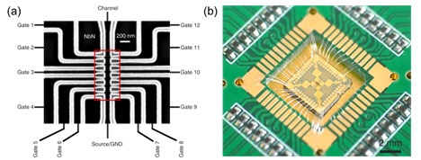 图1. (a) 采用超导纳米线结构实现的12门控或逻辑门;(b) 超导纳米线数字编码器芯片照片。