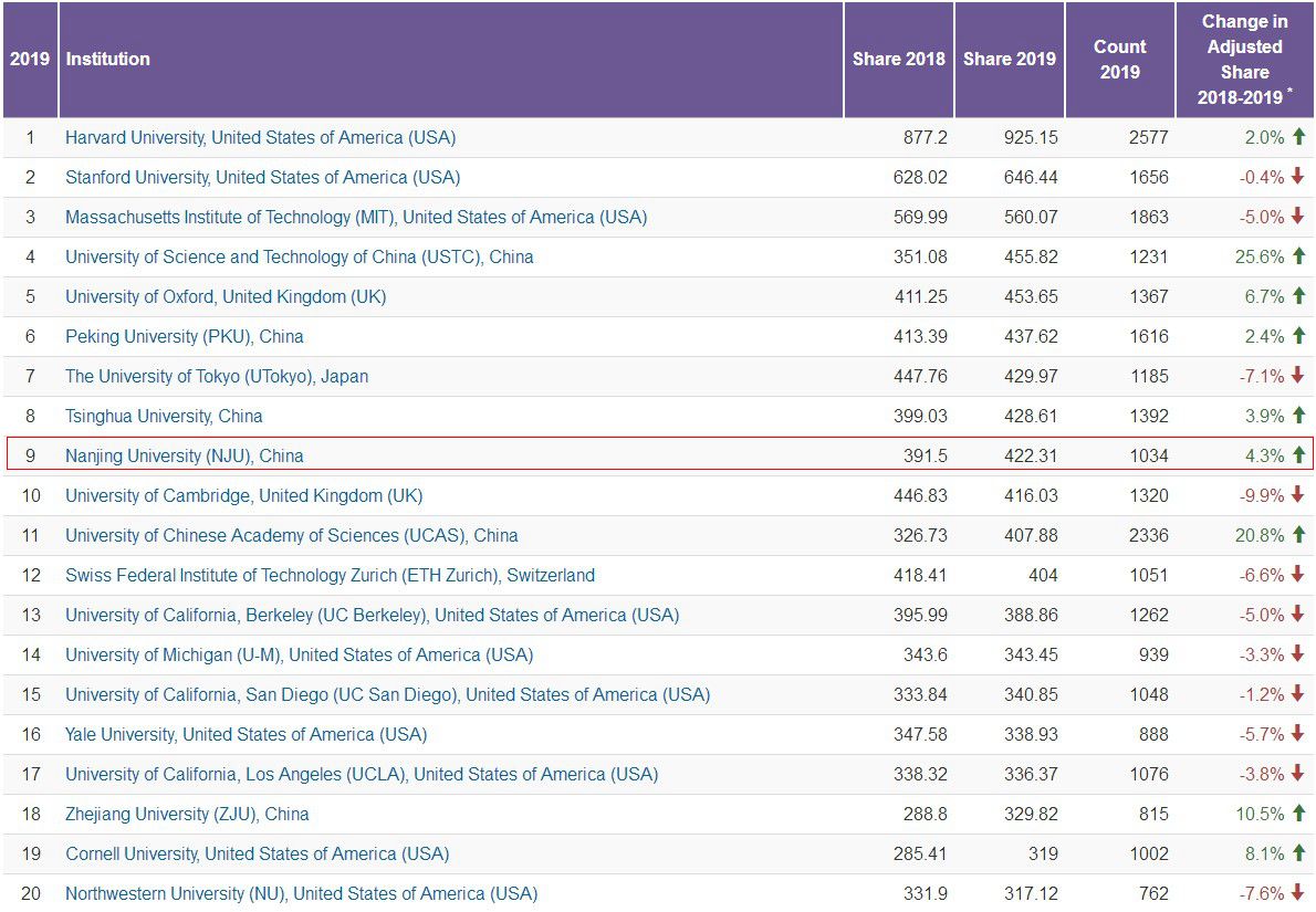 2020年4月30日发布的2020自然指数年度榜单(Nature Index 2020 annual tables)显示,凯发k8官网位居全球科研机构第13位、全球高校第9位、中国高校第4位,调整后的贡献份额增长幅度在全球前20高校中列第6位。