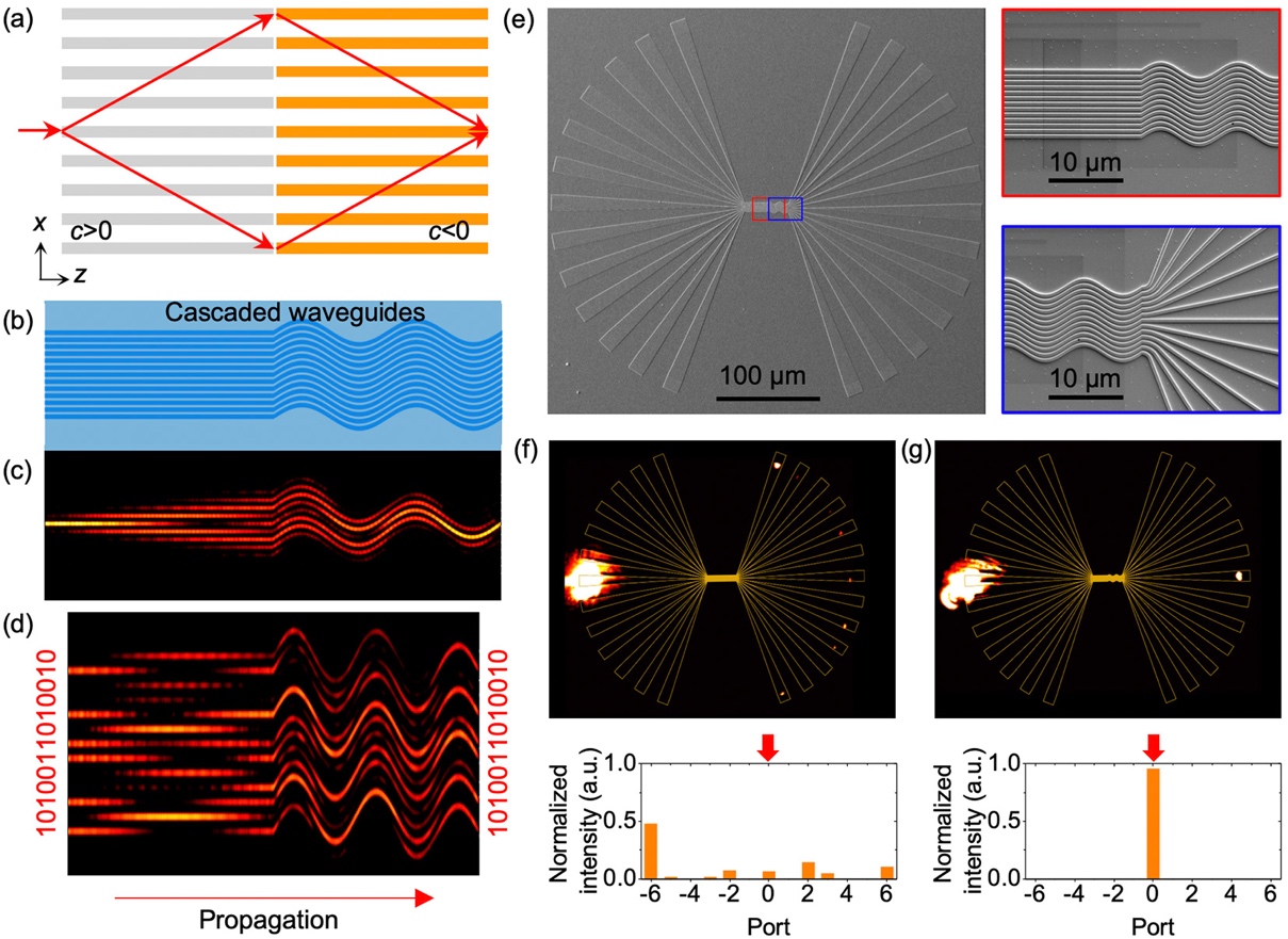 图二级联波导阵列中的亚波长自成像:(a) 正负耦合结合的波导阵列可以超透镜的功能。 (b) 级联波导阵列示意图。 (c) 模拟的光场传播情况。(d) 模拟的 "0"/"1" 编码的信号在级联波导阵列中的传输情况。输出信号完美地复现了输入信号。(e) 实验加工的级联波导样品的SEM 图。(f,g) CCD记录的光场在直波导(f)与级联波导(g)样品中的传播情况。下方的柱状图展示了输出端口光场强度分布情况,红色箭头标注了光场输入的位置。