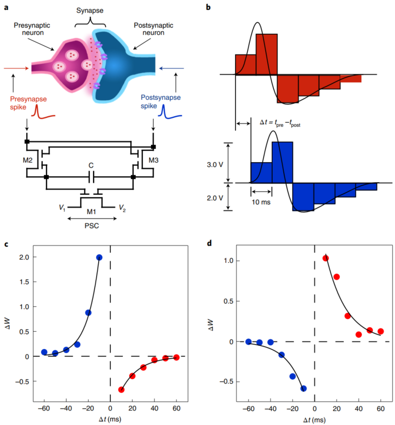 除了构建可重构的逻辑电路之外,研究人员还将ETH器件应用到神经形态电路方面。传统硅基场效应晶体管的器件电流开关特性由单一端口(栅极电压信号)控制,难以模拟生物神经系统的多端调控特性,因此需要耗费大量的资源(超过10个晶体管)才能实现模拟生物突触功能的电路,这也在很大程度上限制了传统类脑芯片的集成密度。在实验中,研究人员仅仅利用了3个EHT器件和一个电容元件设计了可重构的突触电路,实现了对生物突触的时间脉冲依赖可塑性(Spike-Timing-Dependent Plasticity)功能的模拟,以及对赫布(Hebbian)学习规则和反赫布(Anti-Hebbian)学习规则的模拟。