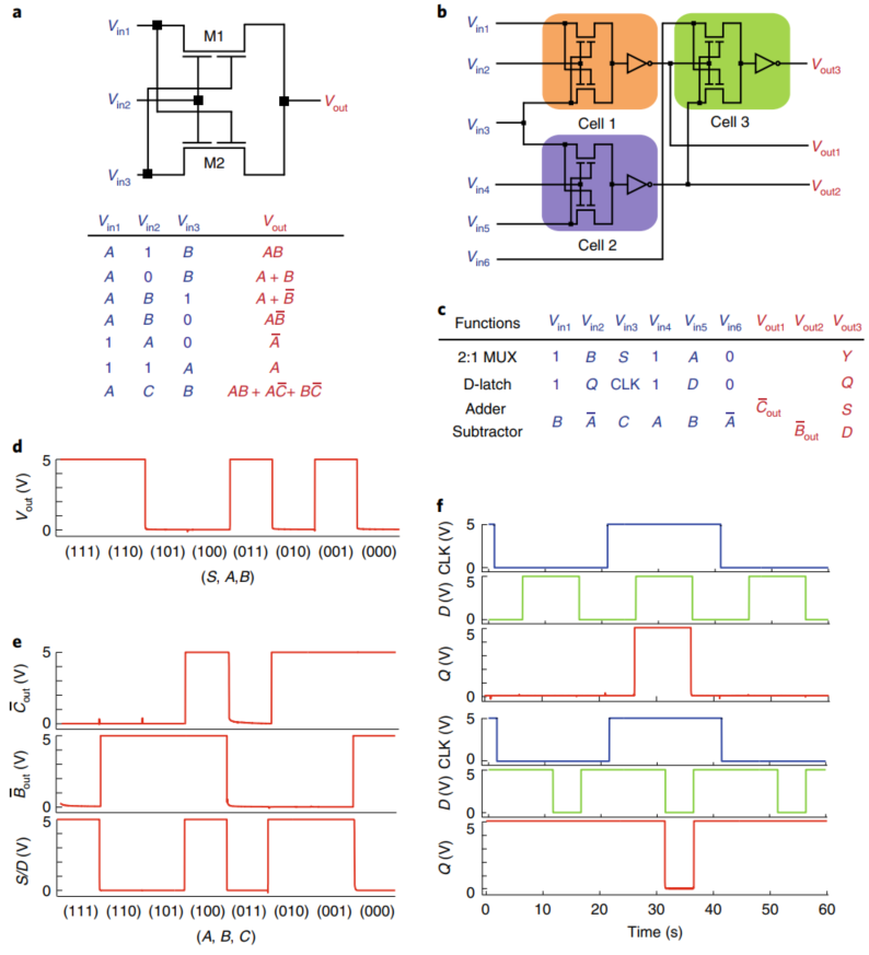 团队首先将2个ETH器件进行串联,构建了一个基本逻辑单元,通过选择不同的信号输入方式,该逻辑单元可以执行基本的逻辑功能,包括"逻辑非"(NOT gate)、"与门"(AND gate)、"或门"(OR gate)、"电压跟随"(Follower)、"实质蕴涵"(Material implication)、"借位输出"(Borrow output)等。该逻辑单元可以作为基本级联模块来进一步设计可重构电路。在实验中,研究人员通过对3个逻辑单元进行级联(共6个ETH器件),设计和实现了一种可重构逻辑电路。通过重构信号输入方式,该电路能执行包括加法器(Adder)、减法器(Subtractor)、2:1多路选择器(MUX)、D-锁存器(D-latch)等微处理器常用的逻辑功能。而采用传统硅基互补逻辑技术,需要耗费28个晶体管才能构建出可执行加法器逻辑功能的电路。基于ETH器件设计的可重构逻辑电路,不仅能够大幅节省晶体管资源,输出信号质量与工作频率也都可以与传统硅基技术相比拟。
