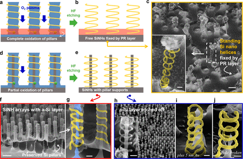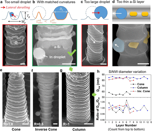 硅基三维纳米螺旋(3D nanohelices结构是开发新一代手性光学柔性机电和生物传感应用的基础共性构架单元,却难以通过传统的光刻工艺批量制备。虽然传统自组装生长方法可制备出各种随机取向的纳米螺旋,其尺寸调控精确性、空间排列一致性以及形貌定制可控性都远达不到器件集成的需求。为此,凯发k8官网电子学院余林蔚、徐骏教授课题组基于自主创新的平面IPSLS纳米线生长技术,将平面纳米线的精准引导生长成功拓展到三维空间调控和集成。通过金属液滴诱导,在覆盖非晶硅前驱体的"竹状"立柱表面,连续盘旋生长(spiral growth)出直径、间距和纵宽比精确可控的纳米线螺旋"盘龙柱"结构其中柱状支撑结构可以通过前期氧化处理选择性刻蚀,从而释放出排列规则的纳米线三维纳米弹簧阵列,并成功应用于展示各种超可拉伸连接、三维复合结构支撑和电驱动NEMS谐振器件等新型应用。值得指出的是,在盘旋上升或下降的纳米线生长过程中,柱状表面的平行引导沟道(sidewall grooves)发挥了至关重要的作用:正是在其引导下,金属催化液滴首先进行规则地水平盘旋生长,在绕柱一周吸收完本层非晶前驱体后,自动换行生长(line-feeding growth进入下一层引导沟道,从而保证能够一次性生长出连续的纳米线螺旋结构。