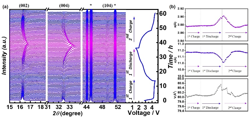 研究团队针对充放电过程中的电荷补偿机理做了反应节点的非原位sXAS和XANES的表征,首圈155 mAh g-1的充电容量来自氧的氧化还原,首圈放电后,阴阳离子协同变价提供电荷补偿,放电容量高达231 mAh g-1。之后1.5-4.5 V电压窗口内充放电的过程中,4.2 V附近持续存在120 mAh g-1 的平台容量,这部分是可逆的阴离子氧化还原容量供应。针对前2圈的充放电过程的材料结构演变研究团队做了原位的XRD表征,并进行了晶格模拟。结果显示,充放电过程中不存在新相的产生,保持了长程有序的P2型ABBA结构,仅002、004峰的偏移与恢复来自充放电过程中的晶格畸变。氧的氧化还原减小了材料在充电到高电压下因钠离子脱出而增大的过渡金属层间斥力,使得材料在宽的电压窗口内无相变发生,模拟结果显示电化学过程中晶胞体积应变仅为0.7%,印证了材料的结构稳定性和循环稳定性,该工作为开发钠离子电池高性能正极材料提供了一种新的策略。