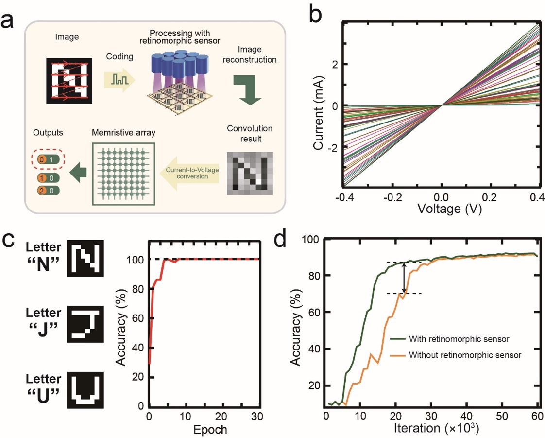 图3,用于图像识别的类脑视觉系统。(a)类脑视觉系统用于图像识别的流程图。用于图像识别的8×8"N","J","U"噪点字母集(c左图)被输入视网膜形态传感器中,进行同步图像感知和预处理;处理后的结果输入忆阻交叉阵列进行图像识别。(b)忆阻器具有线性的电压-电流特征。类脑视觉系统对该字母集的识别率达到100%(c右图)。(d)视网膜形态传感器的存在能够加速图像的识别率和收敛速度。