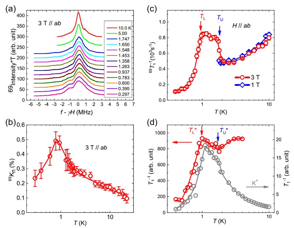 图1. (a) TmMgGaO4单晶在3 T的面内磁场下,69Ga元素在不同温度下的NMR谱; (b) NMR超精细移动69Kn随温度的变化关系;(c) NMR自旋-晶格弛豫率1/69T1随温度的变化关系;(d) 量子蒙特卡洛对1/69T1数据模拟的计算结果。