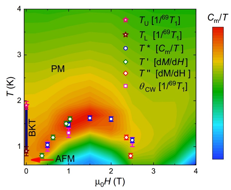 基于已有的实验数据,该团队总结出了面外磁场下系统的磁相图,如图 3所示。零场时,BKT相出现在高温顺磁相和低温反铁磁相之间,NMR和磁化率结果直接确定了该相变的上下边界。在有限场区域,NMR、磁化率、比热等多种实验手段互相佐证,给出了高度一致的相边界。