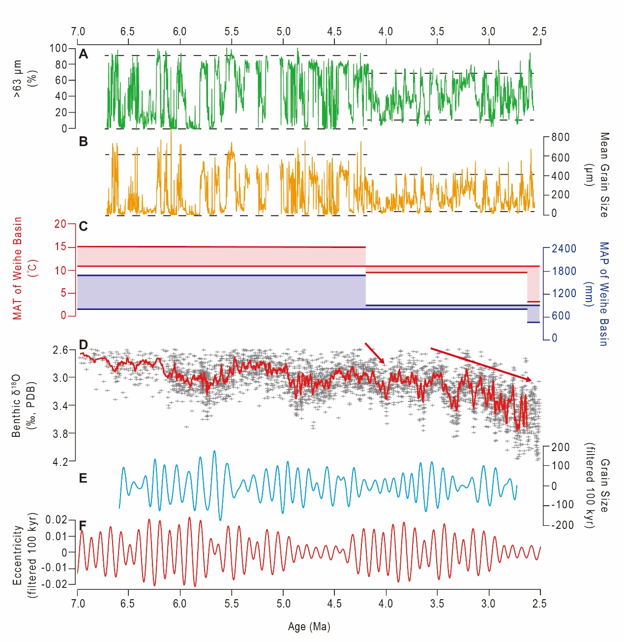 揭示气候长期演变的规律和影响因素,仪器观测时间偏短,需要从自然界的"档案记录"中找到这一问题的答案。鹿化煜课题组通过对陕西中部渭河盆地的长期考察研究,他们在陕西渭南市阳郭镇一带,发现了很好的河湖相沉积序列 (1)他们通过对这些沉积物详细的地层研究、古地磁定年和哺乳动物化石分析,确认这些沉积物堆积在距今约6-2百万年前,正好处在地球较为温暖的上新世阶段。这些沉积物由流水携带沉积在盆地中,在流水量大流水强度的时期,携带来的沉积颗粒粗;反之,沉积颗粒细。基于这一原理,他们分析了沉积序列中近3000份样品的颗粒大小分布,发现粒度时间序列在距今4.2百万年前有明显转型(2);周期分析表明,粒度时间序列具有地球运动轨道周期特征,表明高纬和低纬地区接受的太阳辐射量变化,都影响到季风降水的长期变化。研究的时间处于上新世温暖期,这一成果对于理解未来气候变化、全球变暖背景下东亚季风气候的数值模拟等,均具有重要意义。