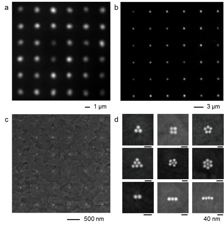 图2 小尺寸纳米颗粒的组装结果 a)10纳米量子点 b)20纳米聚苯乙烯荧光小球 c)20纳米金颗粒 d)20纳米金颗粒的各种规则密堆团簇